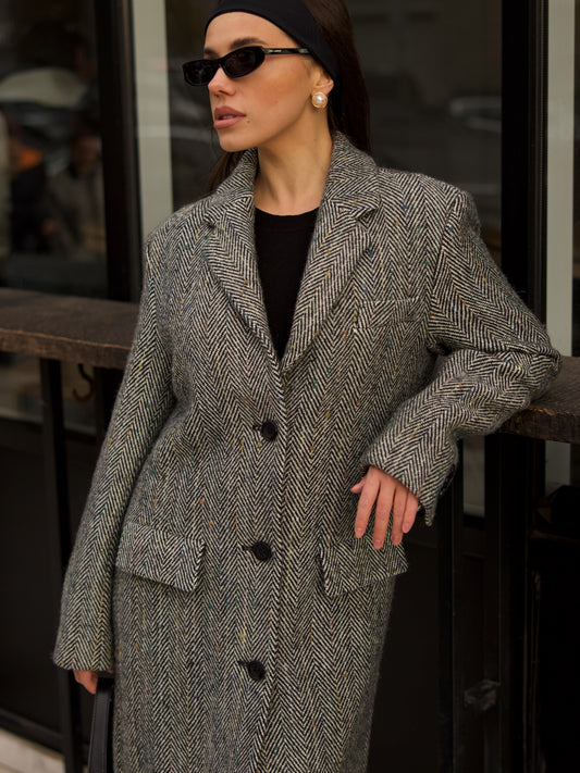 Burgundowy płaszcz wełniany w jodełkę typu raglan