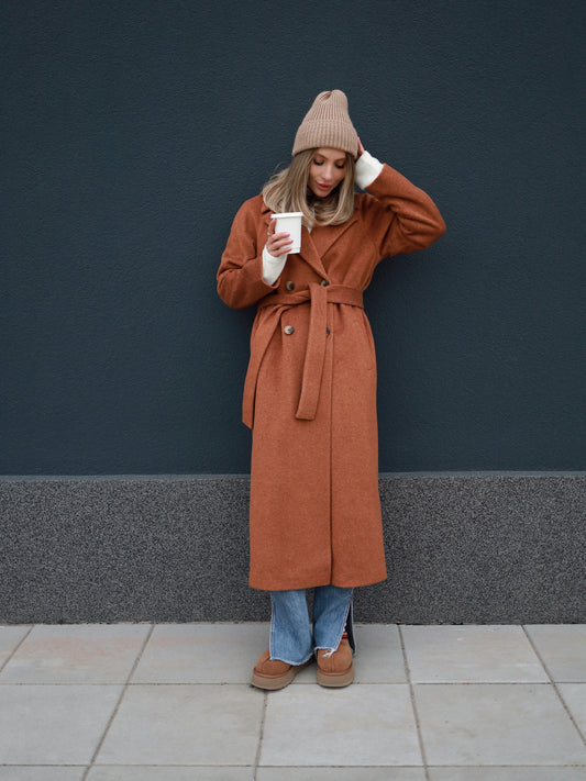 Płaszcz wełniany dwurzędowy w kolorze rdzawoczerwonym z paskiem