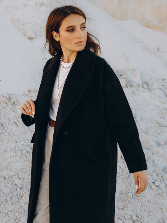 Czarny wełniany dwurzędowy płaszcz z paskiem