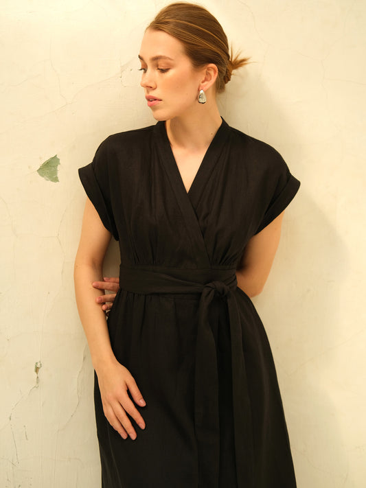 Sukienka lniana kopertowa midi, Jasnoniebieska