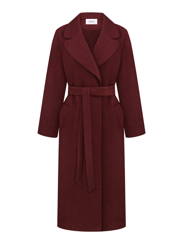 Elevate your wardrobe with our women’s long burgundy coat, a hand-stitched masterpiece crafted from high-quality fabric with wool. This stylish wool burgundy coat features lapels, slit pockets, and long sleeves, enhanced with an external trim tape for a refined look. The matching belt allows you to accentuate your waist, making this topcoat both elegant and flattering.