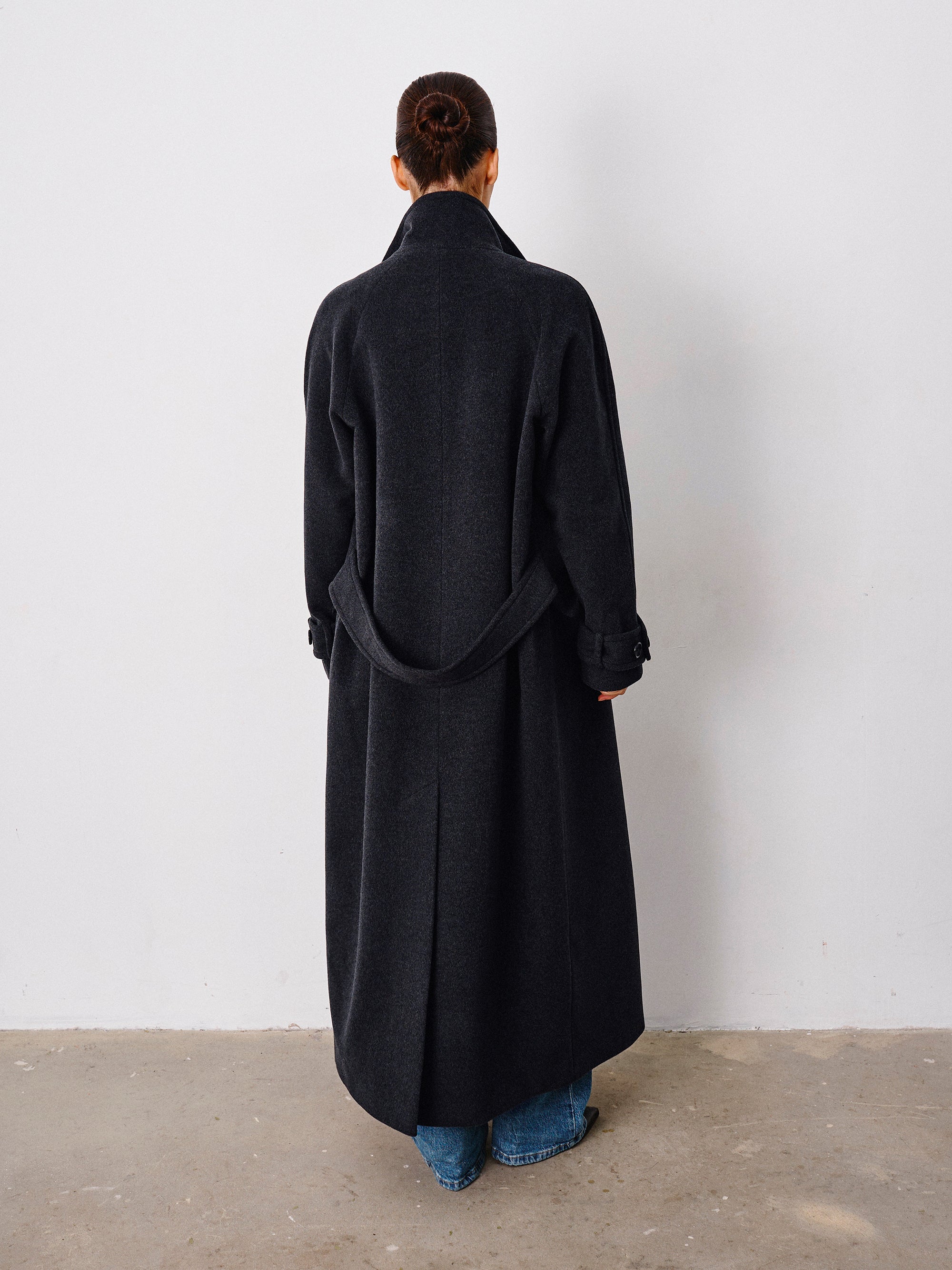The silhouette is intentionally generous. It doesn’t impose — it allows. It offers space. For warmth. For thought. For being. The coat does not shape you; it receives you.