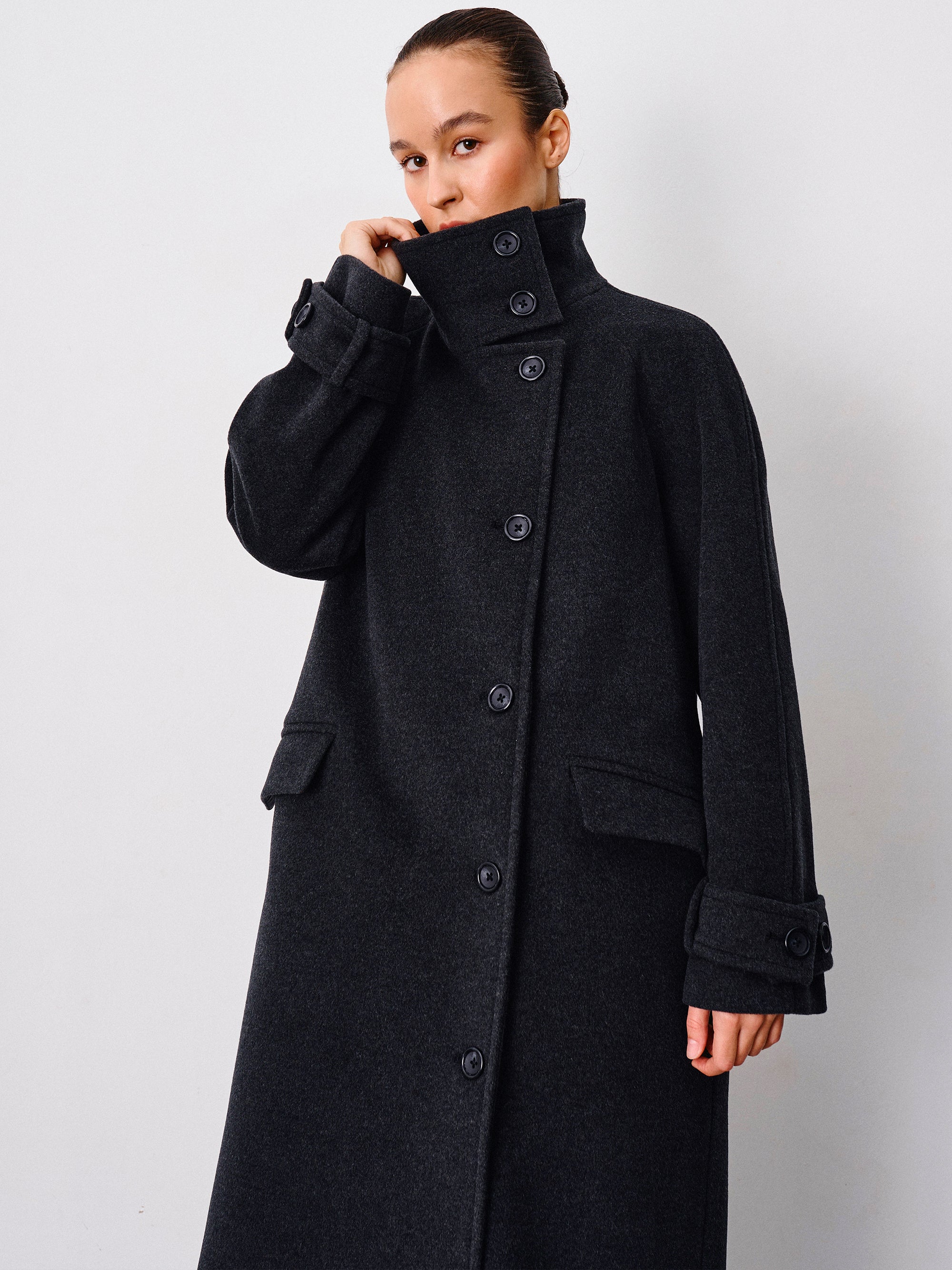 Graphite Wool Coat with Stand Collar – Wabi-Sabi Elegance | CHELIE